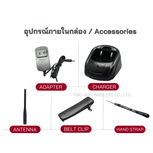 - อุปกรณ์ภายในกล่อง : ตัวเครื่อง แบตเตอรี่ แท่นชาร์จ อะแด็บเตอร์ คลิปหลัง เสายาง สายคล้องมือ และคู่มือการใช้งาน