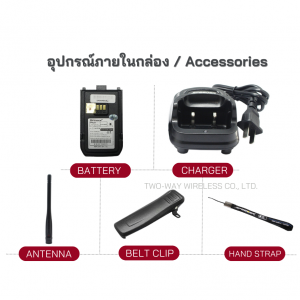 - อุปกรณ์ภายในกล่อง : ตัวเครื่อง แบตเตอรี่ แท่นชาร์จ คลิปหลัง เสายาง สายคล้องมือ และคู่มือการใช้งาน